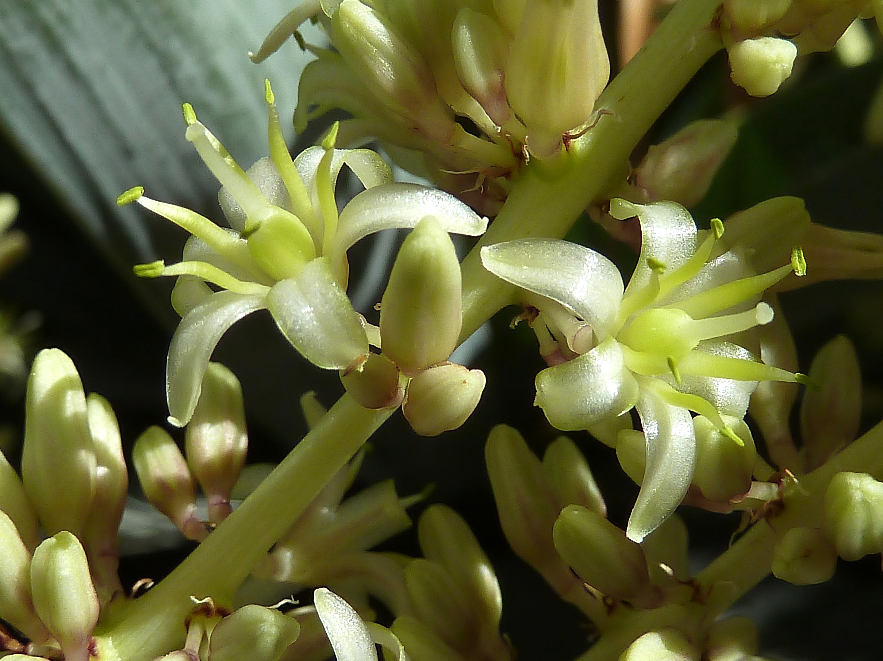 Flores odoríferas, hermafroditas e actinomórficas, com perianto com 7–10 mm, verde-esbranquiçado, composto por 6 peças unidas na base em tubo curto e campanulado. 6 estames, não excedendo em comprimento o perianto. Ovário súpero.